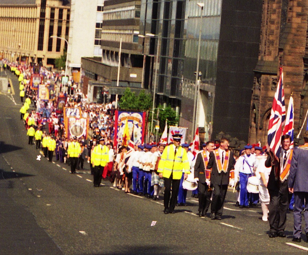 Aug. 27th, 2019 11:04 amРаз уж потянуло на воспоминания, то главным впечатлением от Глазго была, конечно, не первомайская демонстрация, а ежевоскресные марши Оранжистов. Оранжисты - протестанты, поклонники Вильгельма III Оранского, таким образом протестуют против католиков. Поражало многолюдье этих шествий, веселье и боевой задор. Вот пара фрагментов этих маршей: